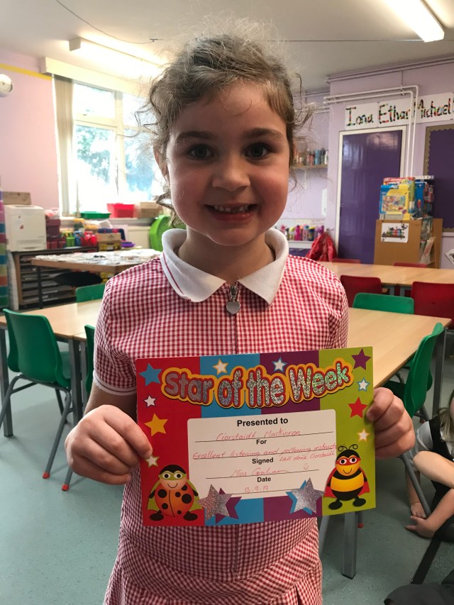 A big well done to Ciorstaidh who is our Star of the Week in P1 this week for Excellent listening and following instructions. Keep up the great work Ciorstaidh ππππ