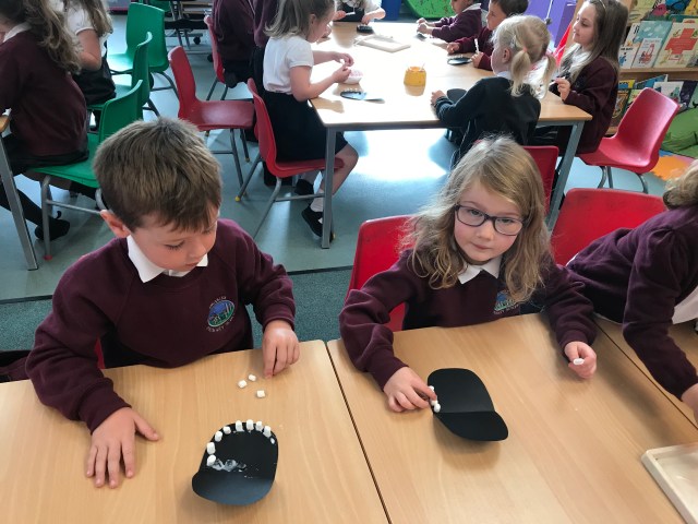 We then had lots of fun making our own mouths using mini marshmallows! We will use these for our dental hygiene display. This was developing our fine motor skills as it required us using our pincer grip to pick up the marshmallows. We were also counting and using scissor skills to cut out the tongue!