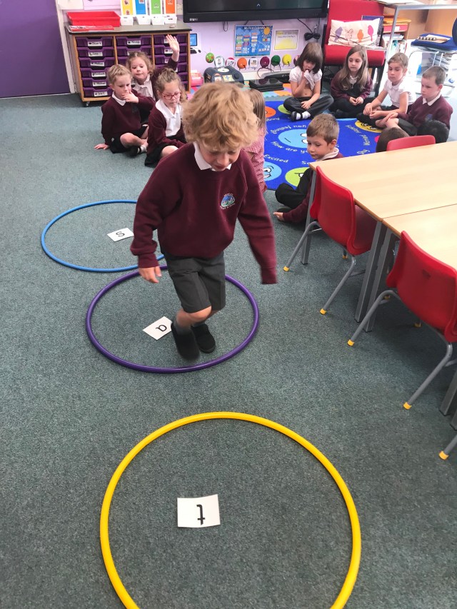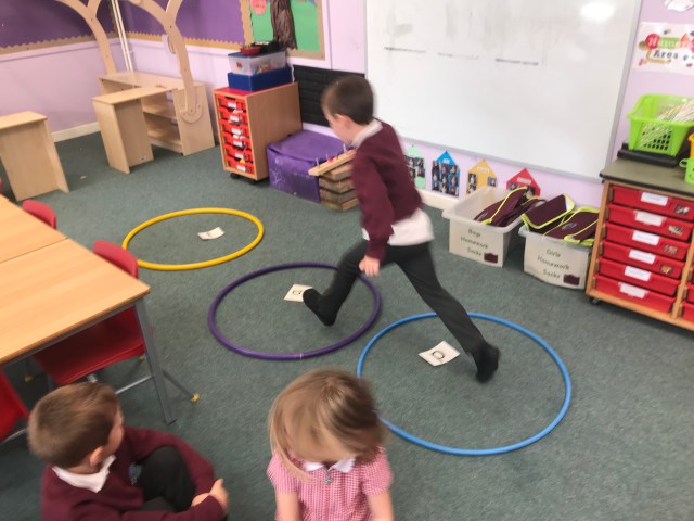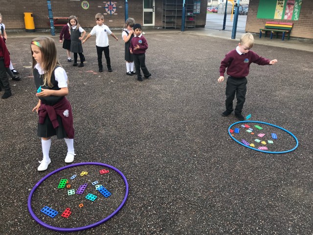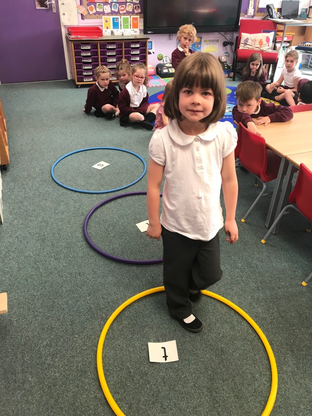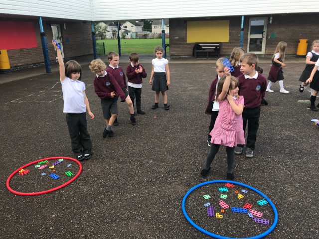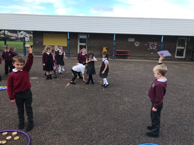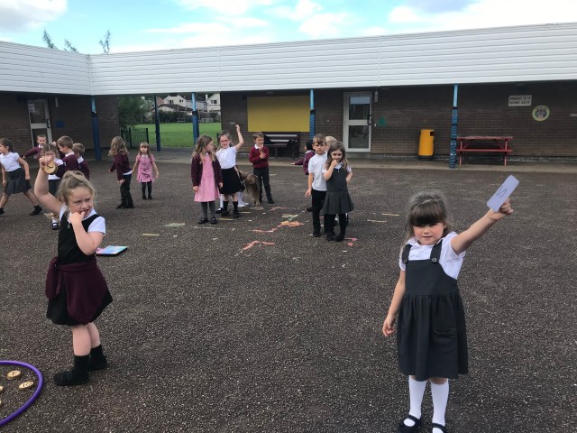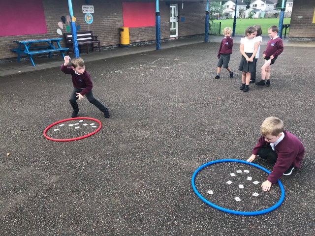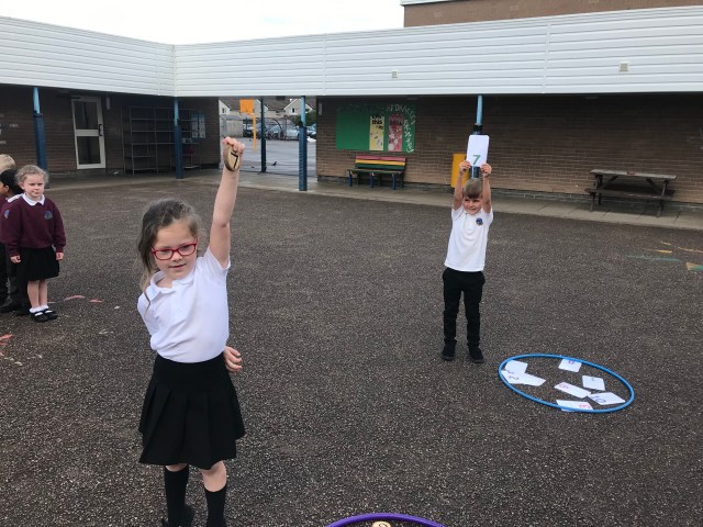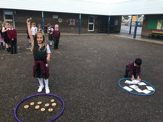 We have been working hard at number ID this week, practising to read, write and order numbers. We played a team game outdoors, where we had to find the number card as quickly as possible, to improve number recognition.