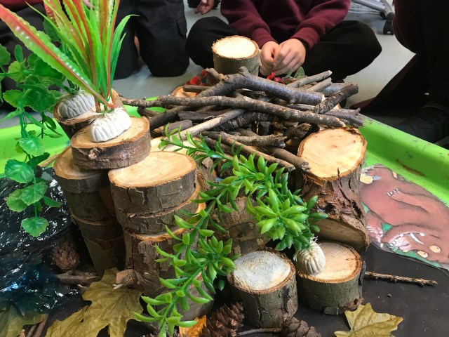 We demonstrated excellent teamwork working with P1/2 to make giant characters for our Gruffalo and Gruffalo’s Child display. We really had to think about character description and used a selection of paint, paper and fabrics to create the characters in groups. There was lots of creativity going on during this task and I can’t wait to see the finished display!