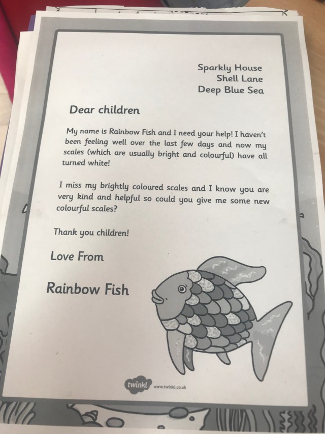 We then read the book ‘The Rainbow Fish’ and after lunch we were amazed to receive a surprise letter from the Rainbow fish asking for our help. πππ