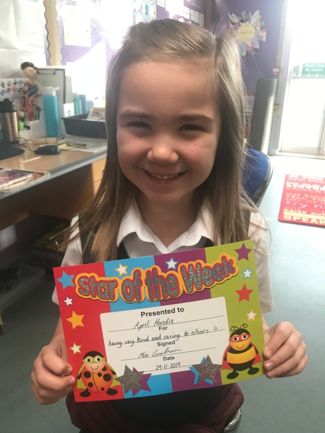 This week’s Star Award goes to April for being kind and caring to others. Kindness is one of our Drakies school values which we have been talking a lot about lately. Well done April, very well deserved. 😊