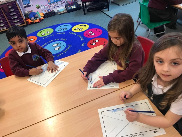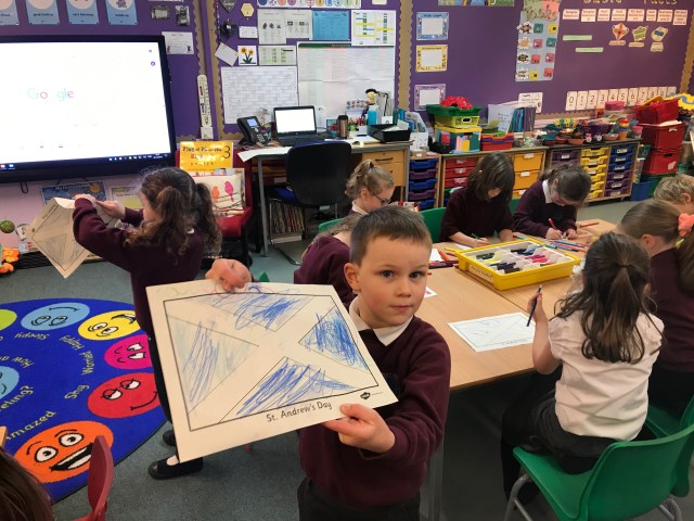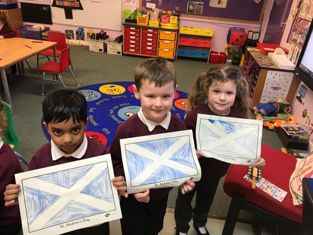 We were learning all about St. Andrew’s Day in P1 today. We listened to some bagpipes music and enjoyed a little bit of Scottish dancing! We then coloured in Saltires and designed our own tartan.