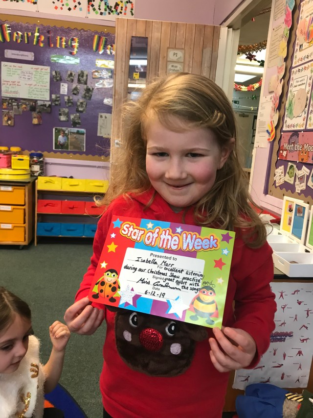 A big well done to Isabella who is P1’s Star of the Week for excellent listening throughout our Christmas Show rehearsals this week and great effort with all the practising!