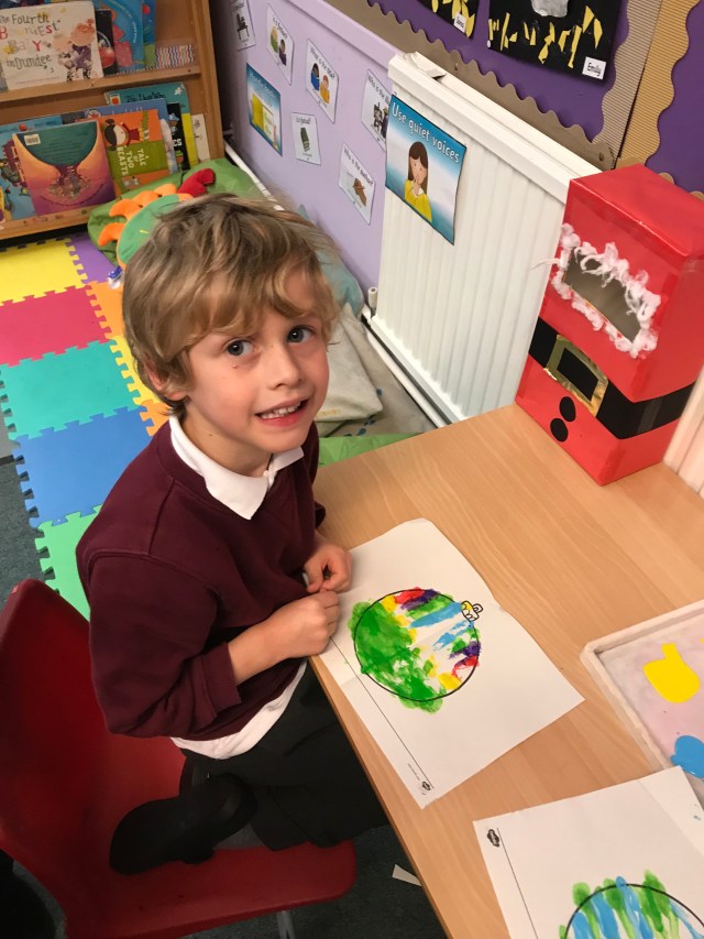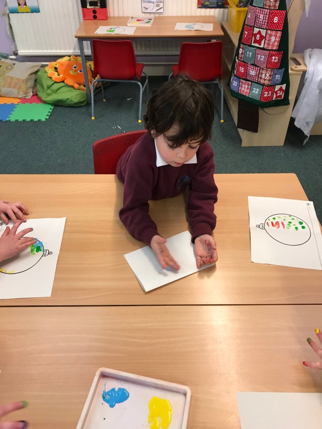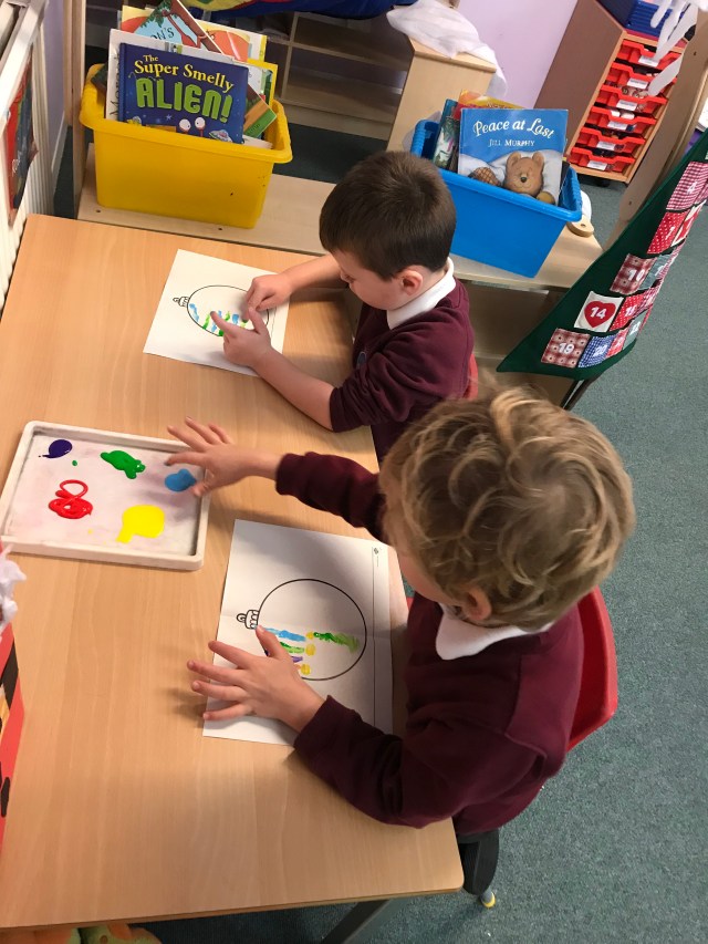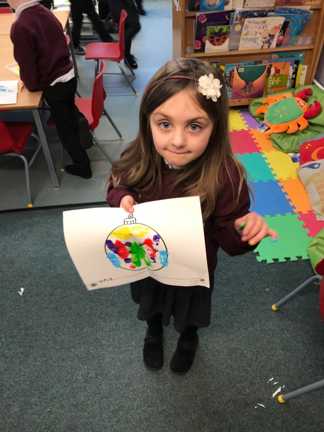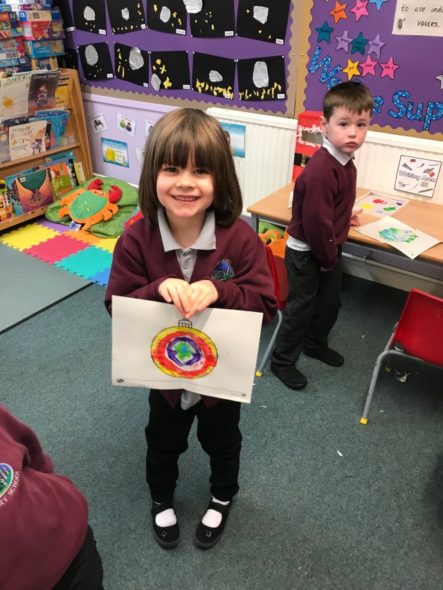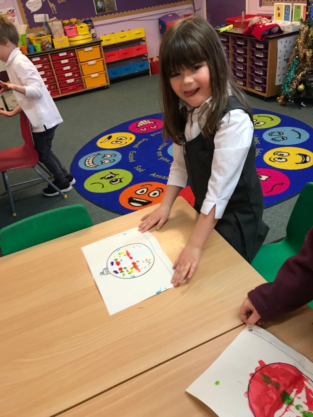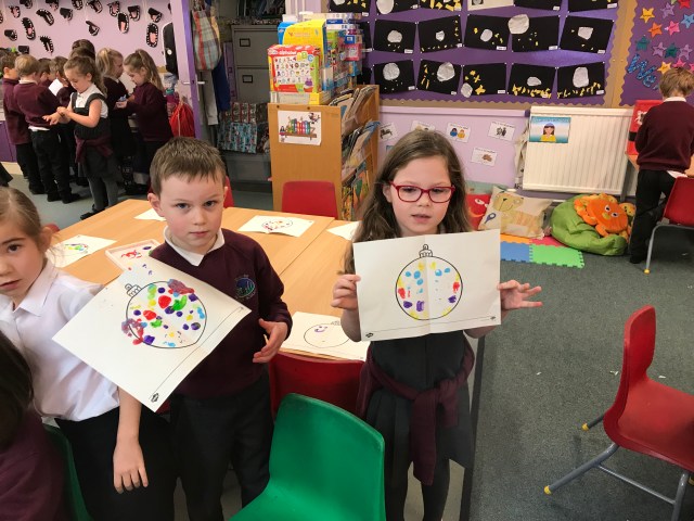 In maths we have been learning about 2D and 3D shapes and today we were looking at symmetry. We had a go at making our own symmetrical Christmas baubles using paint.