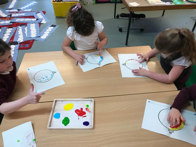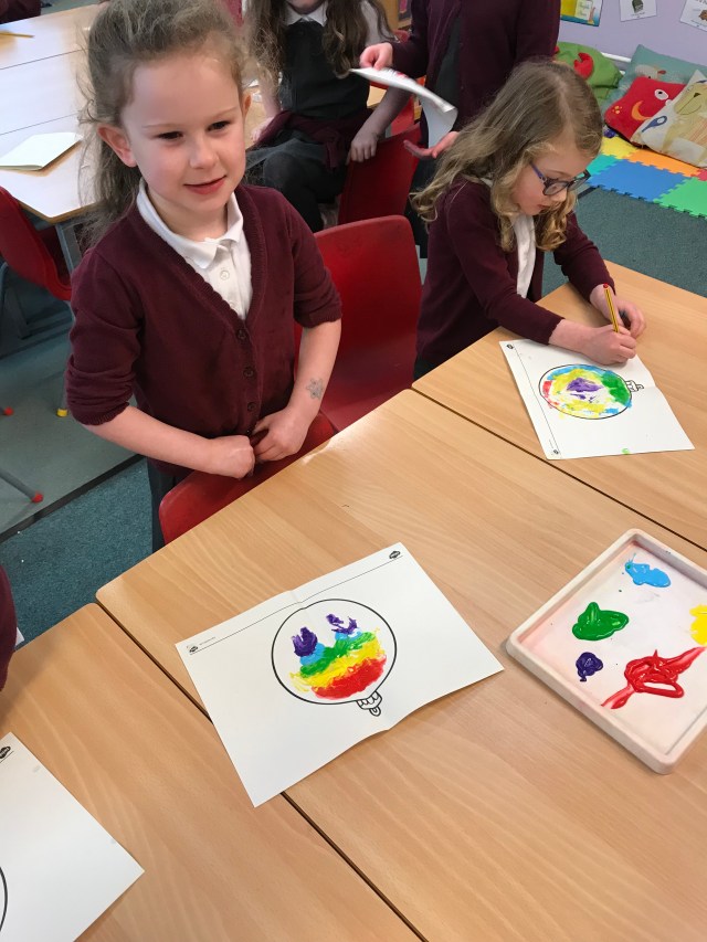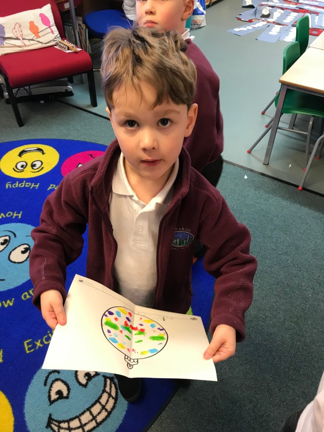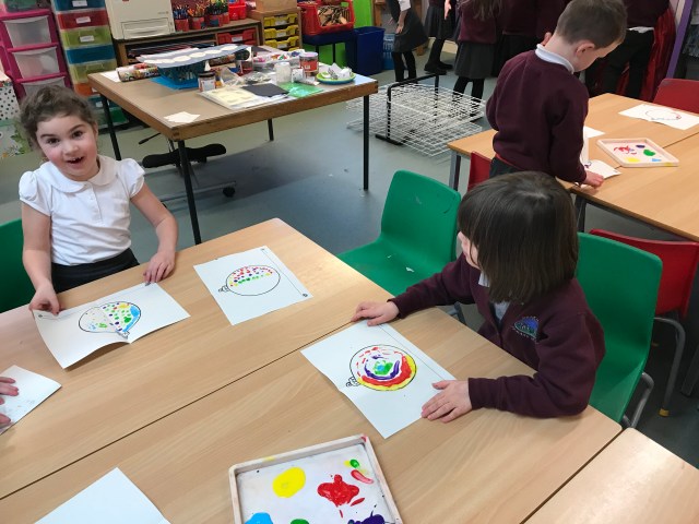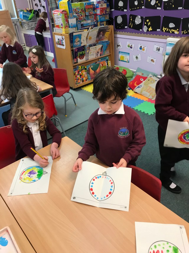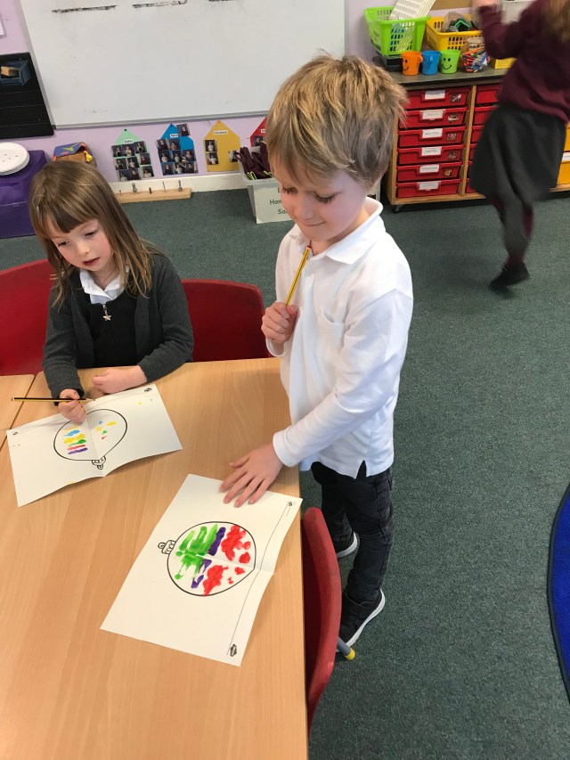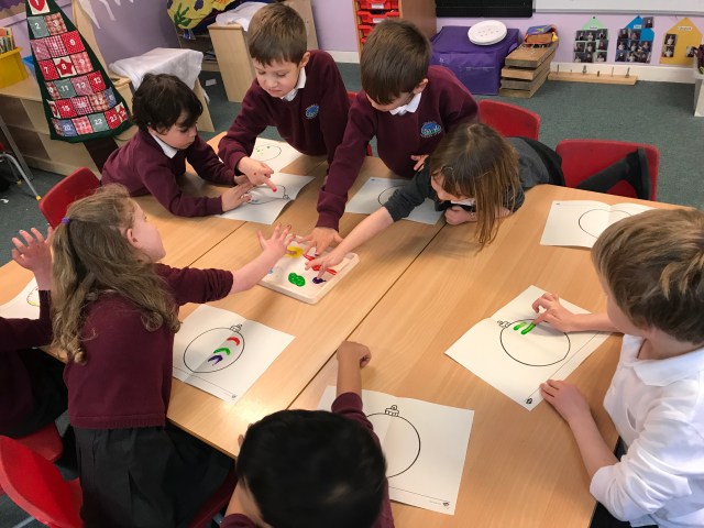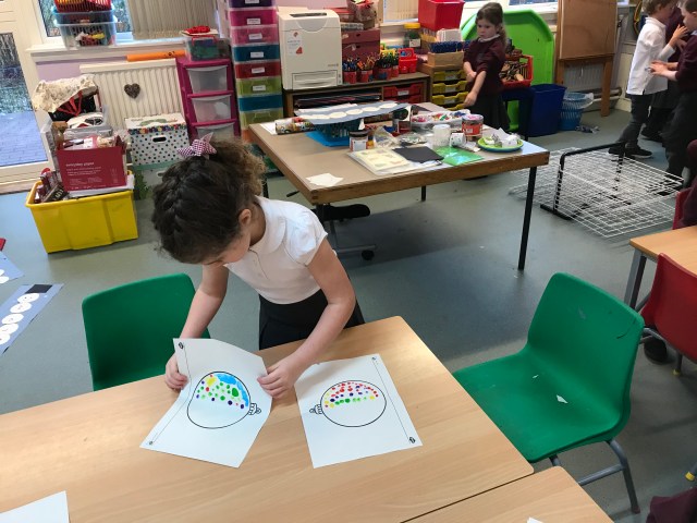 In maths we have been learning about 2D and 3D shapes and today we were looking at symmetry. We had a go at making our own symmetrical Christmas baubles using paint.