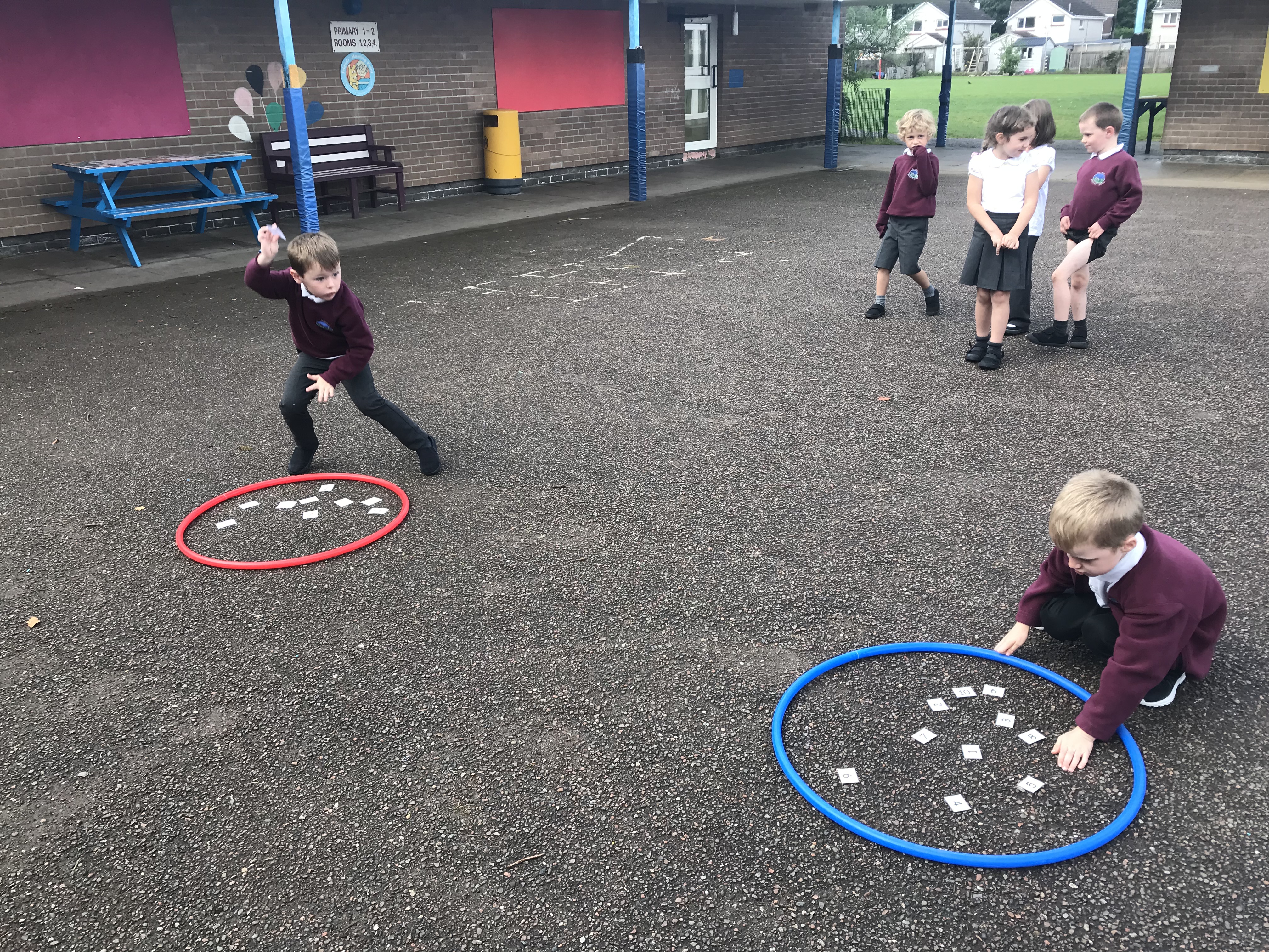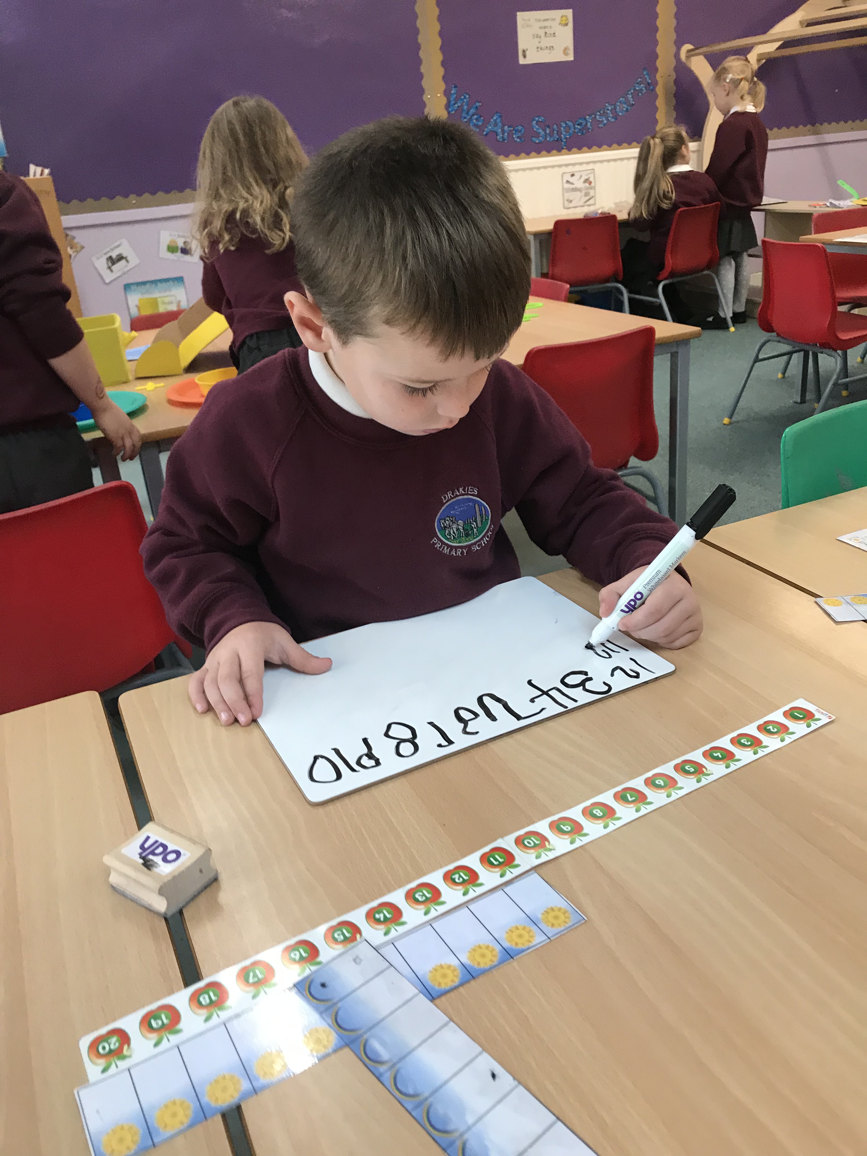 We have been working hard at number ID this week, practising to read, write and order numbers. We played a team game outdoors, where we had to find the number card as quickly as possible, to improve number recognition.