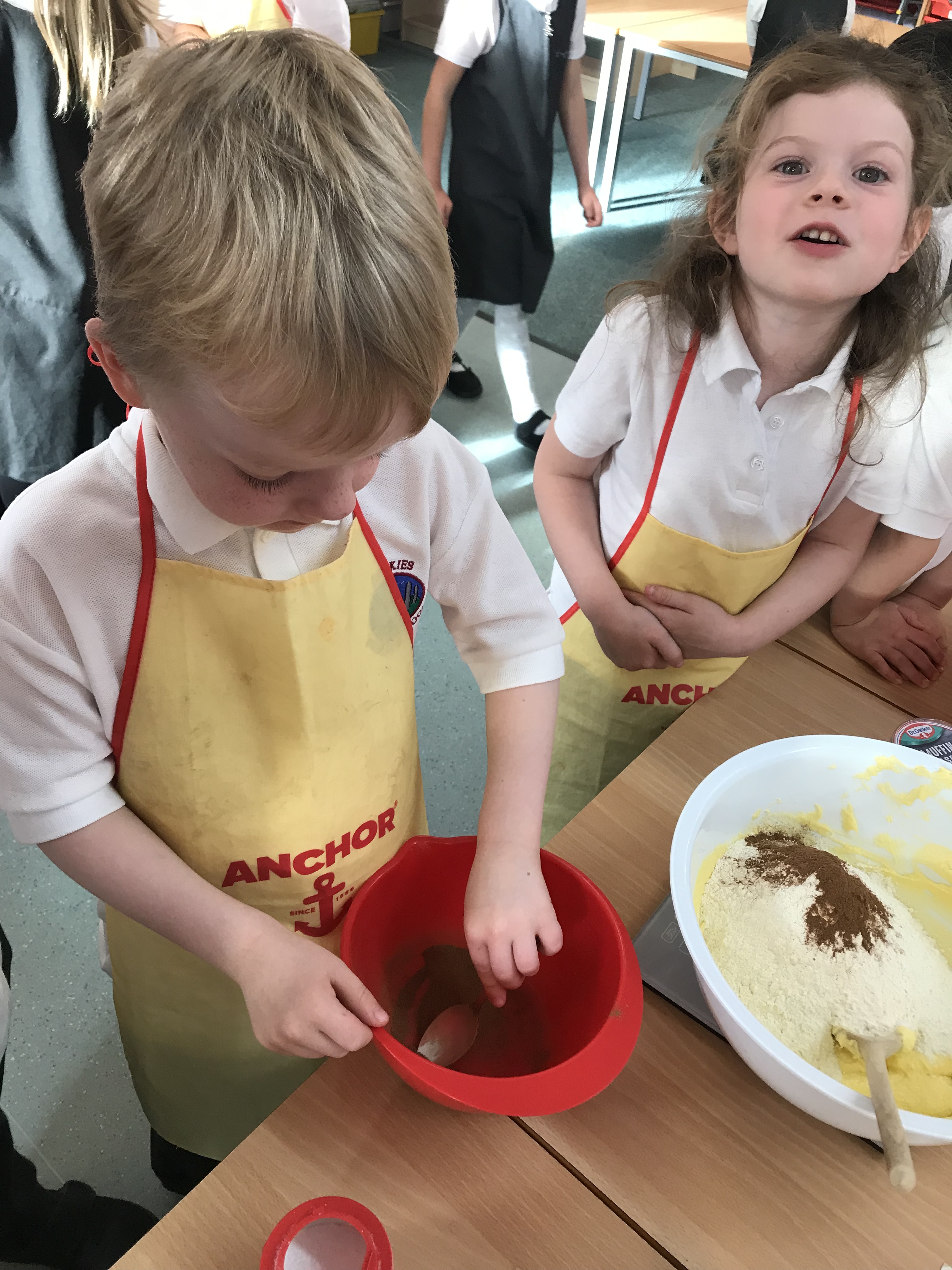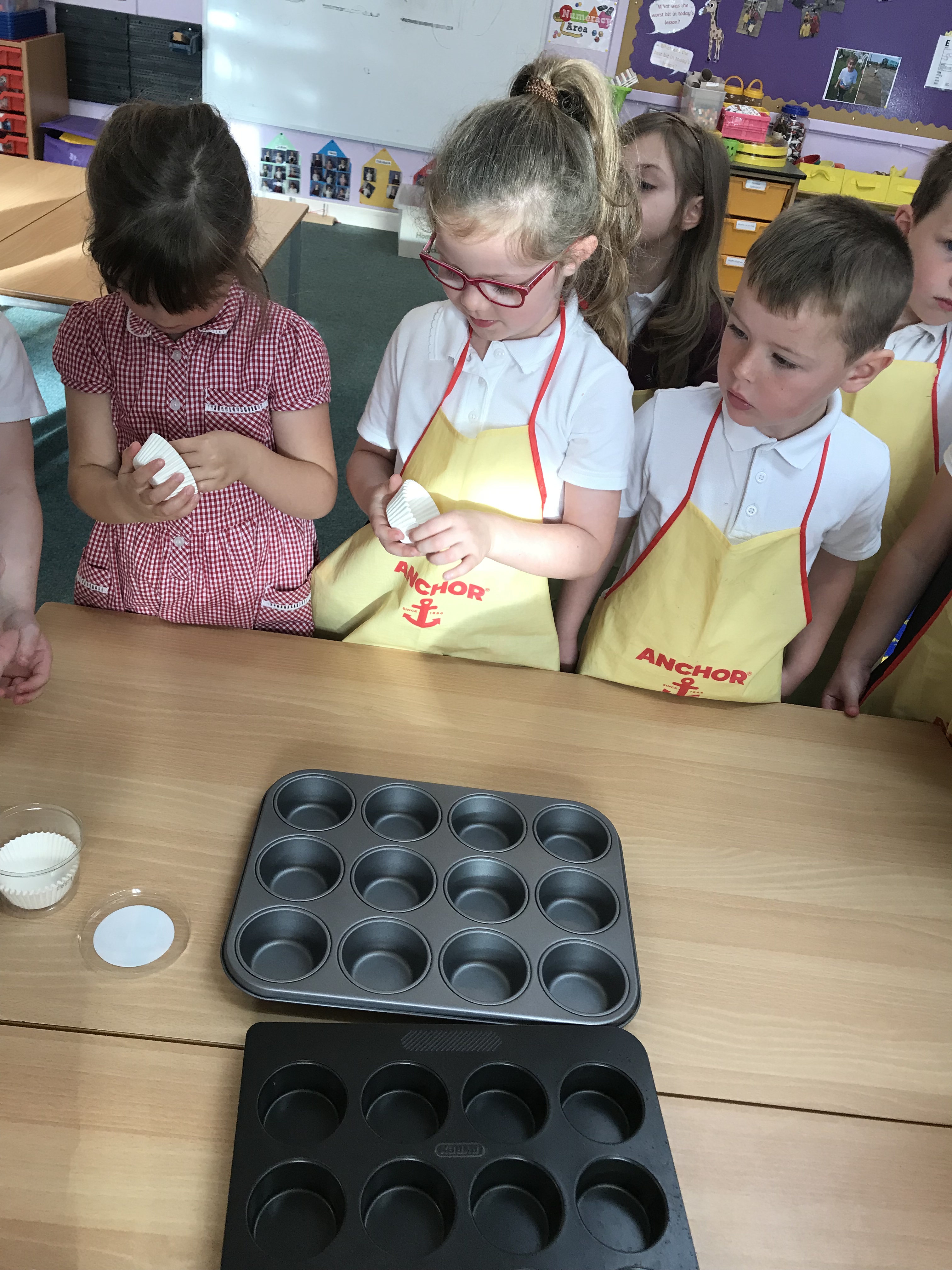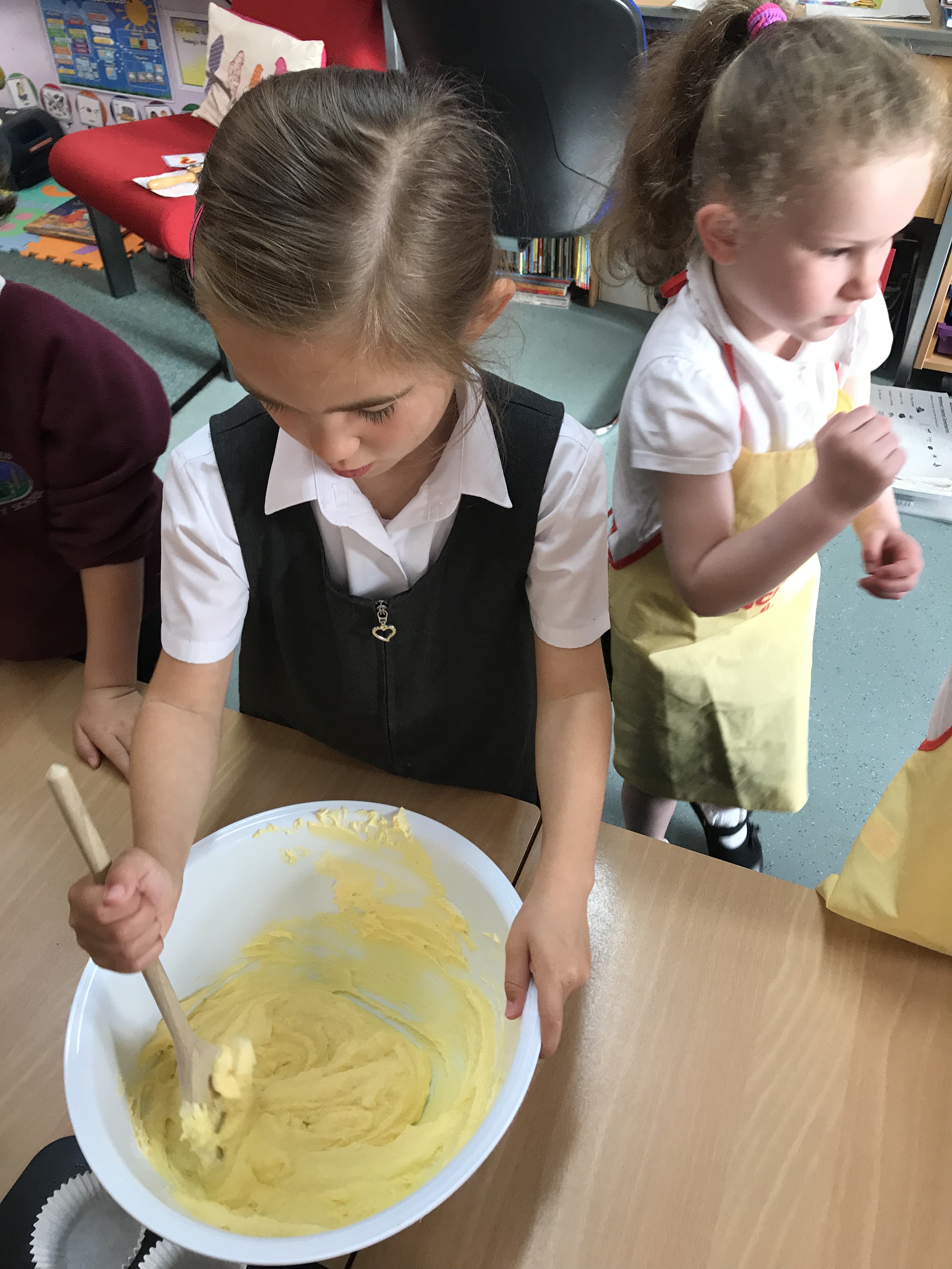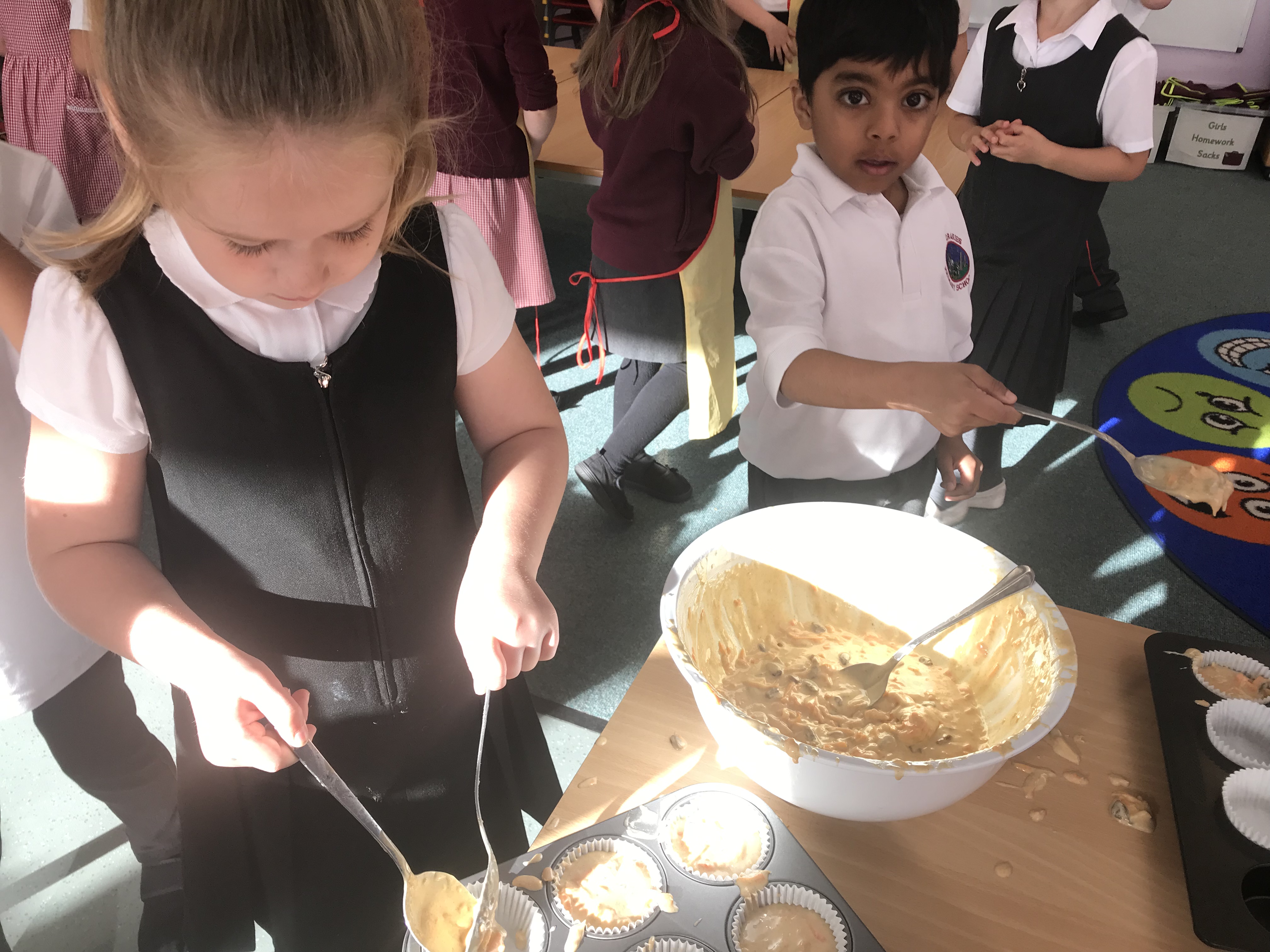 The mixture was ready. Some children thought it smelt like Christmas, some thought it looked yummy and some disagreed! It was now time to put the mixture into cases and they would be ready for the oven.