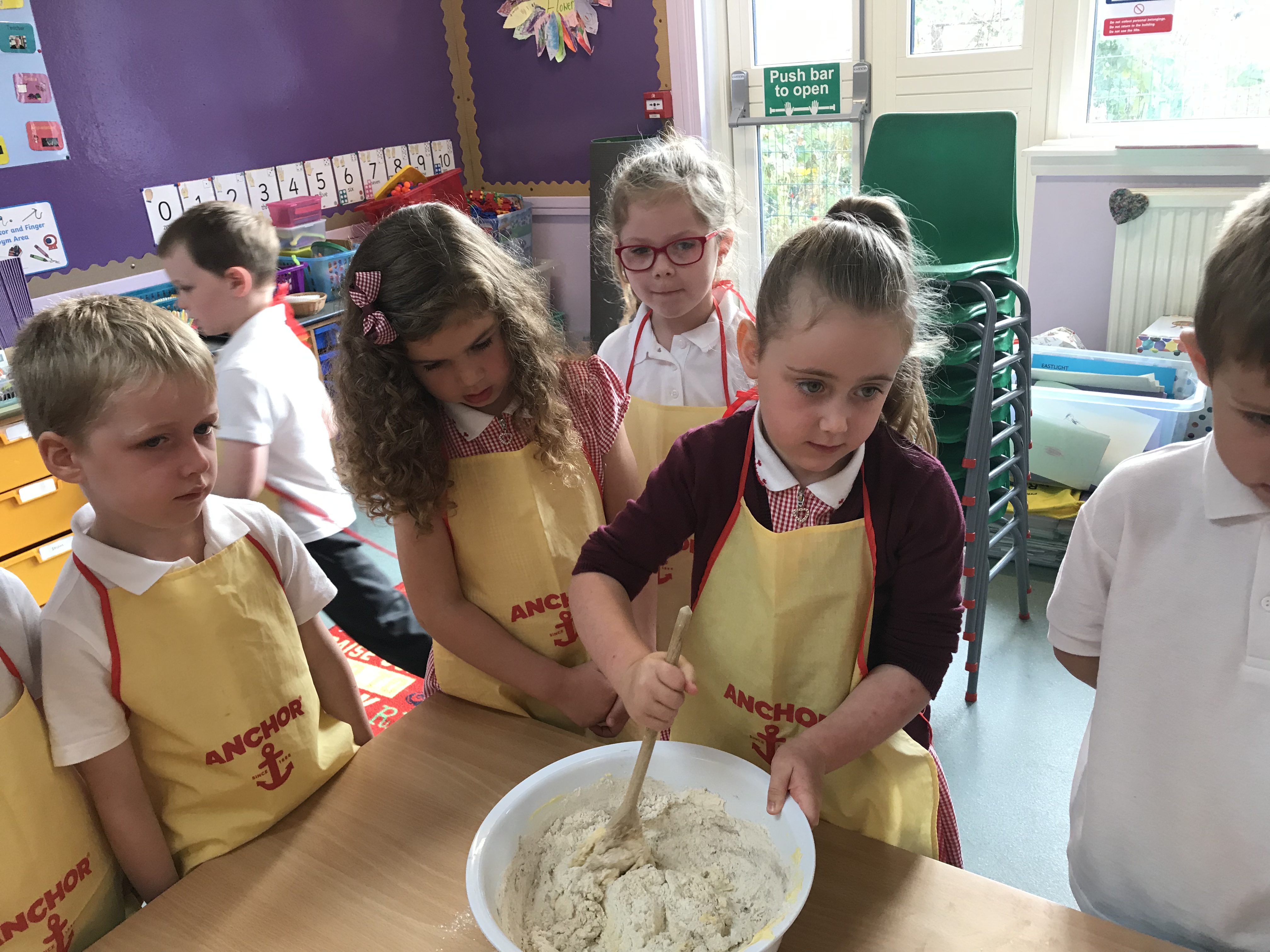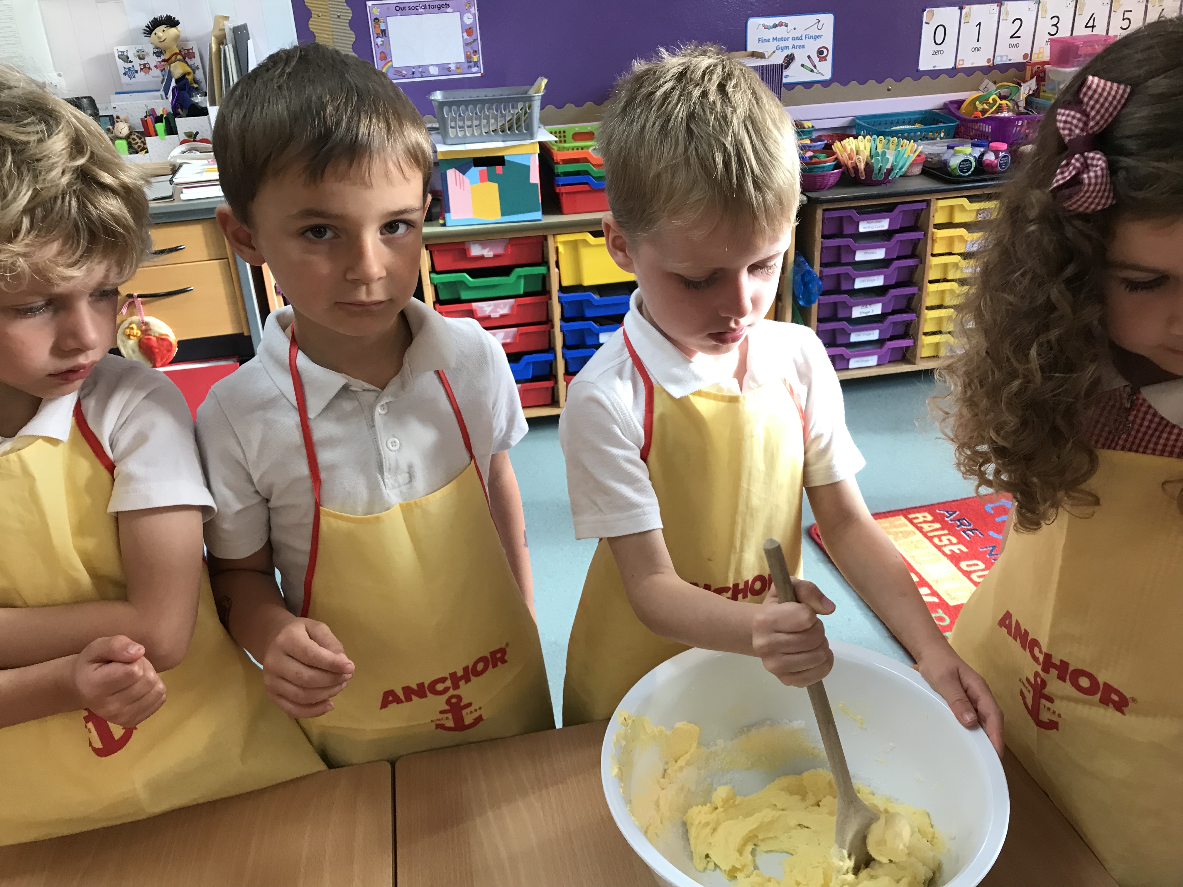 On Friday morning we got busy baking. We talked about the importance of washing our hands before starting to keep germs away, the different ingredients we needed to bake the carrot cakes, the things we would need an adult to help us with and that we need to follow the recipe instructions and not just guess how much of each ingredient to use! The children came up with excellent suggestions. It was time to get started….