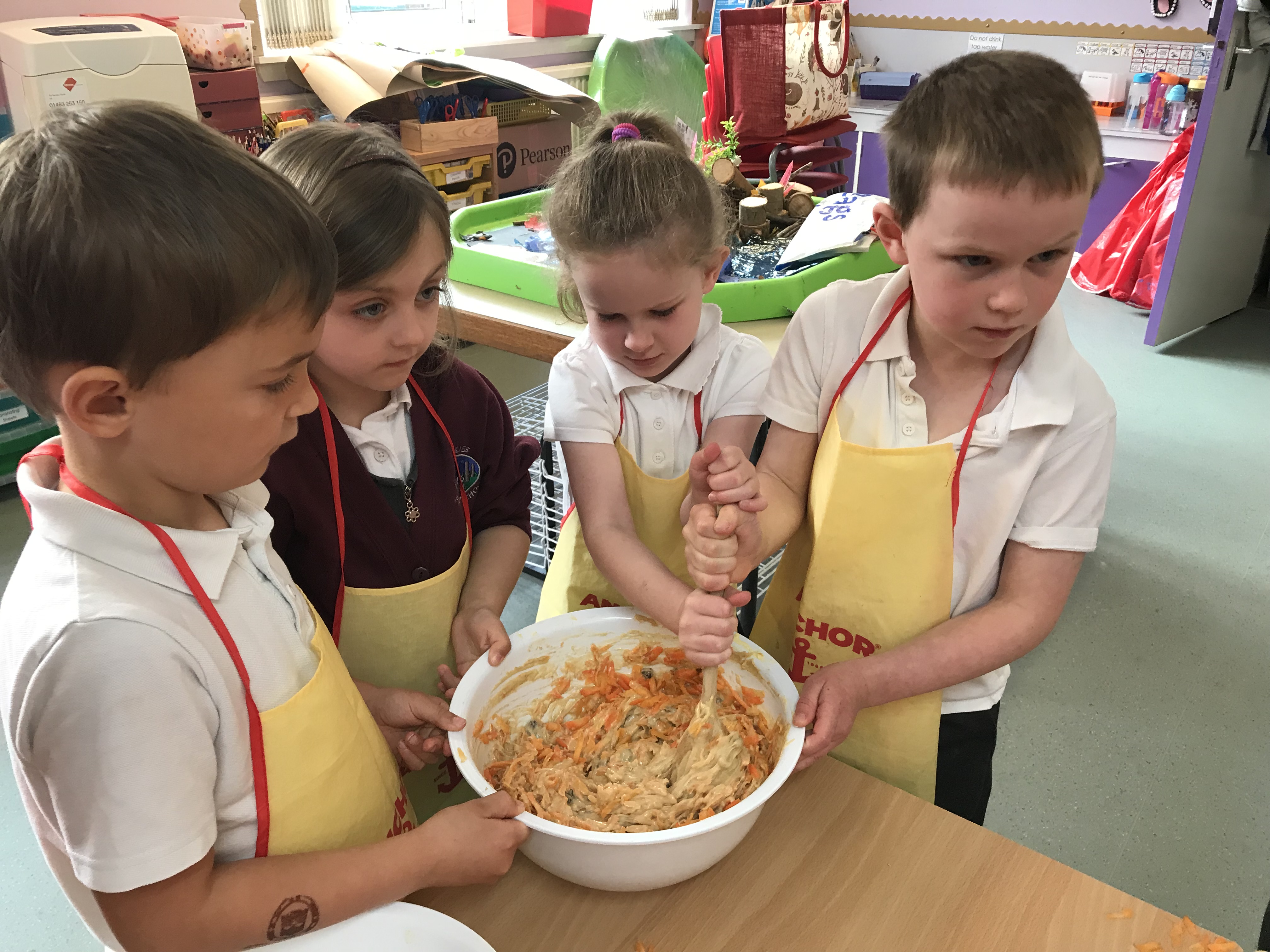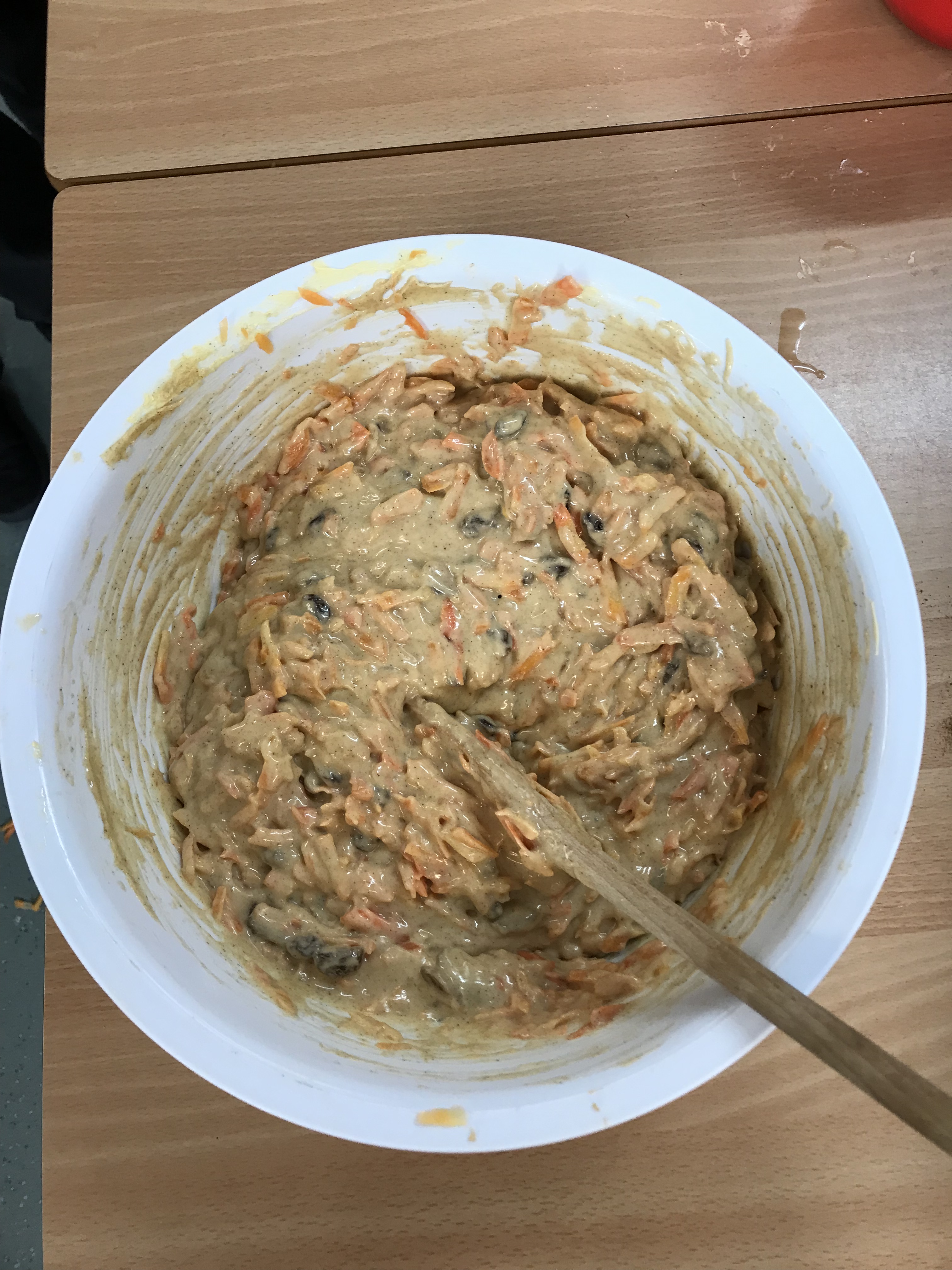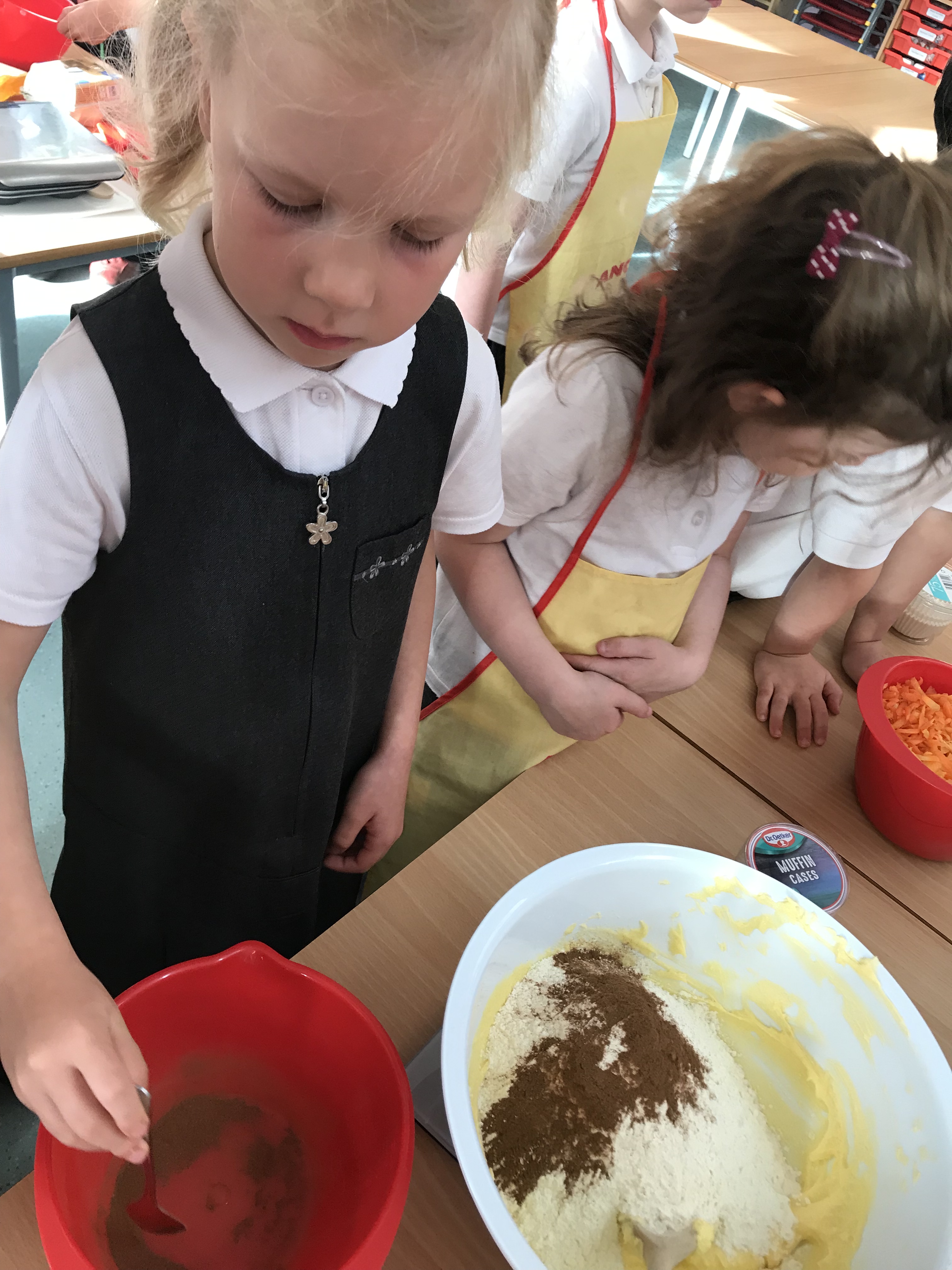 First of all we weighed the ingredients and mixed them all together. The adults helped us grate the carrots (we needed lots and lots!)