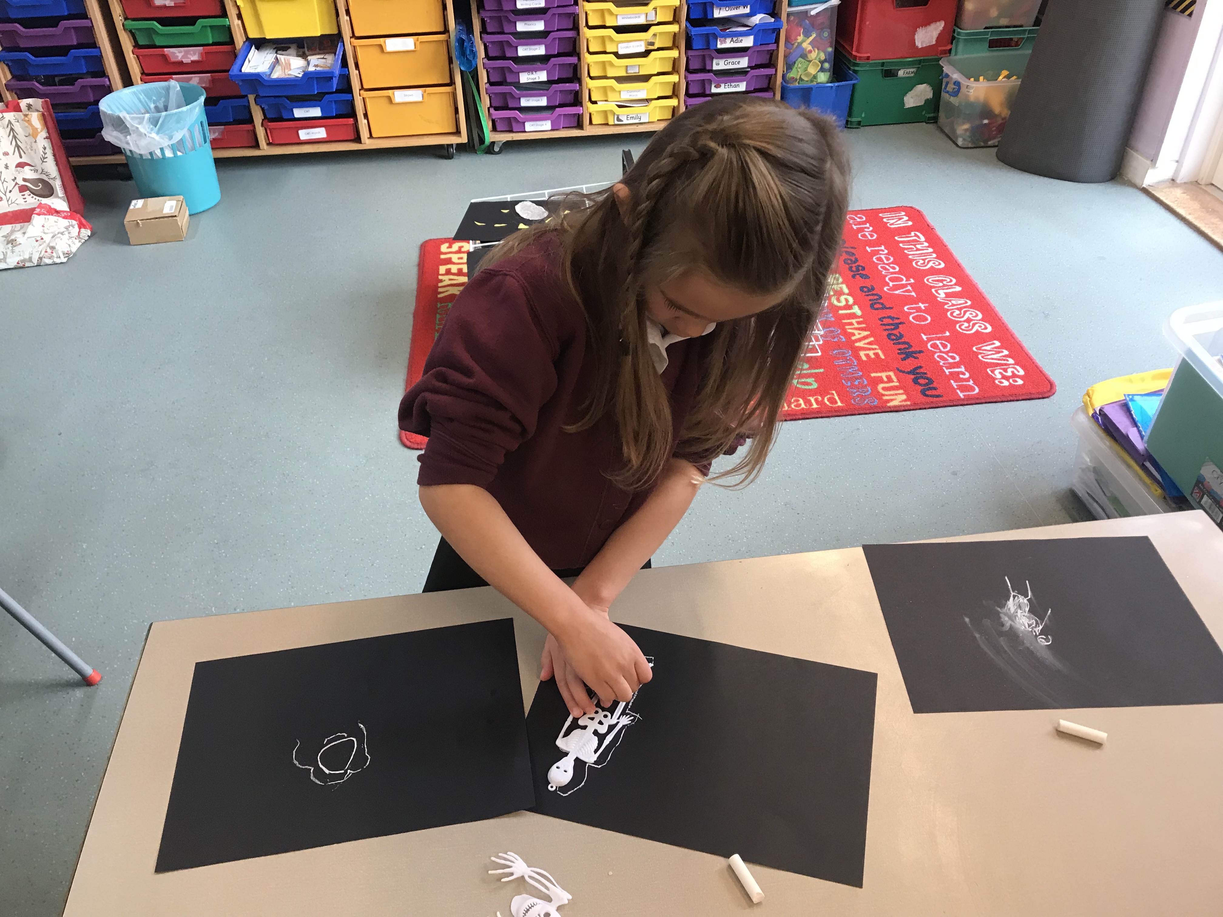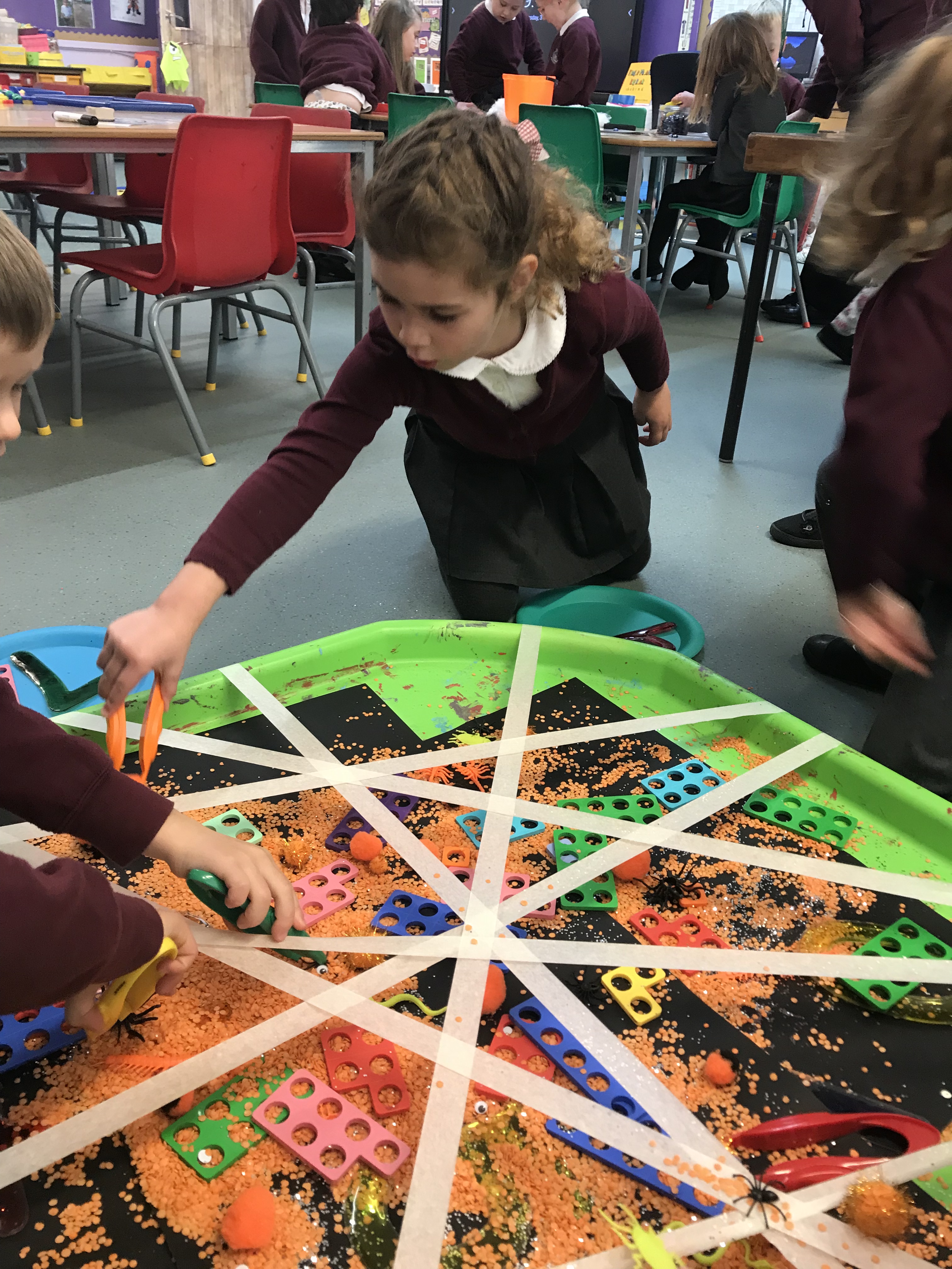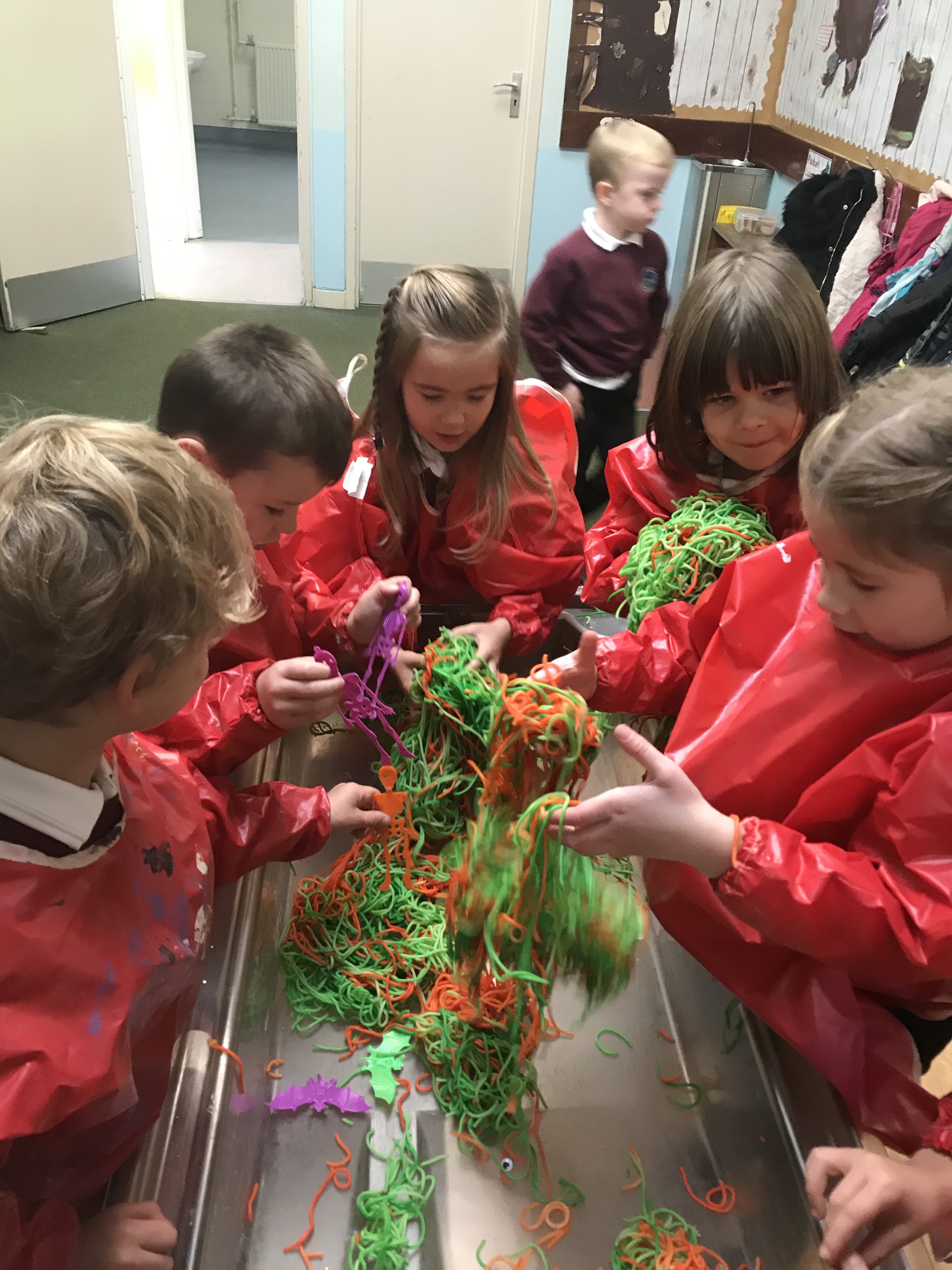 On Thursday morning during soft start we had a selection of activities with a spooky twist! Sticky and slimy sensory play, finger gym (with extra long fingers), a numicon web and skeleton chalk drawings!