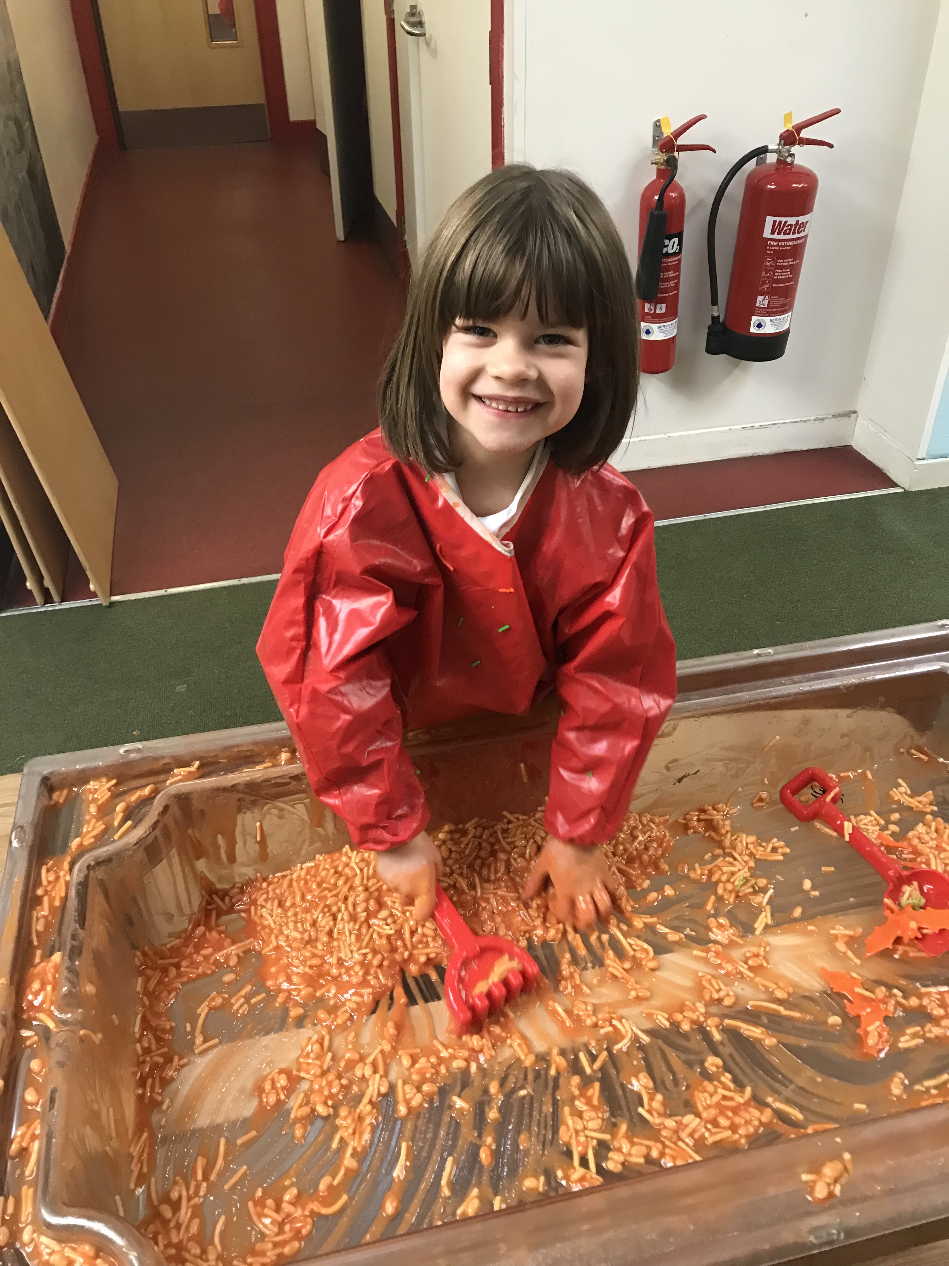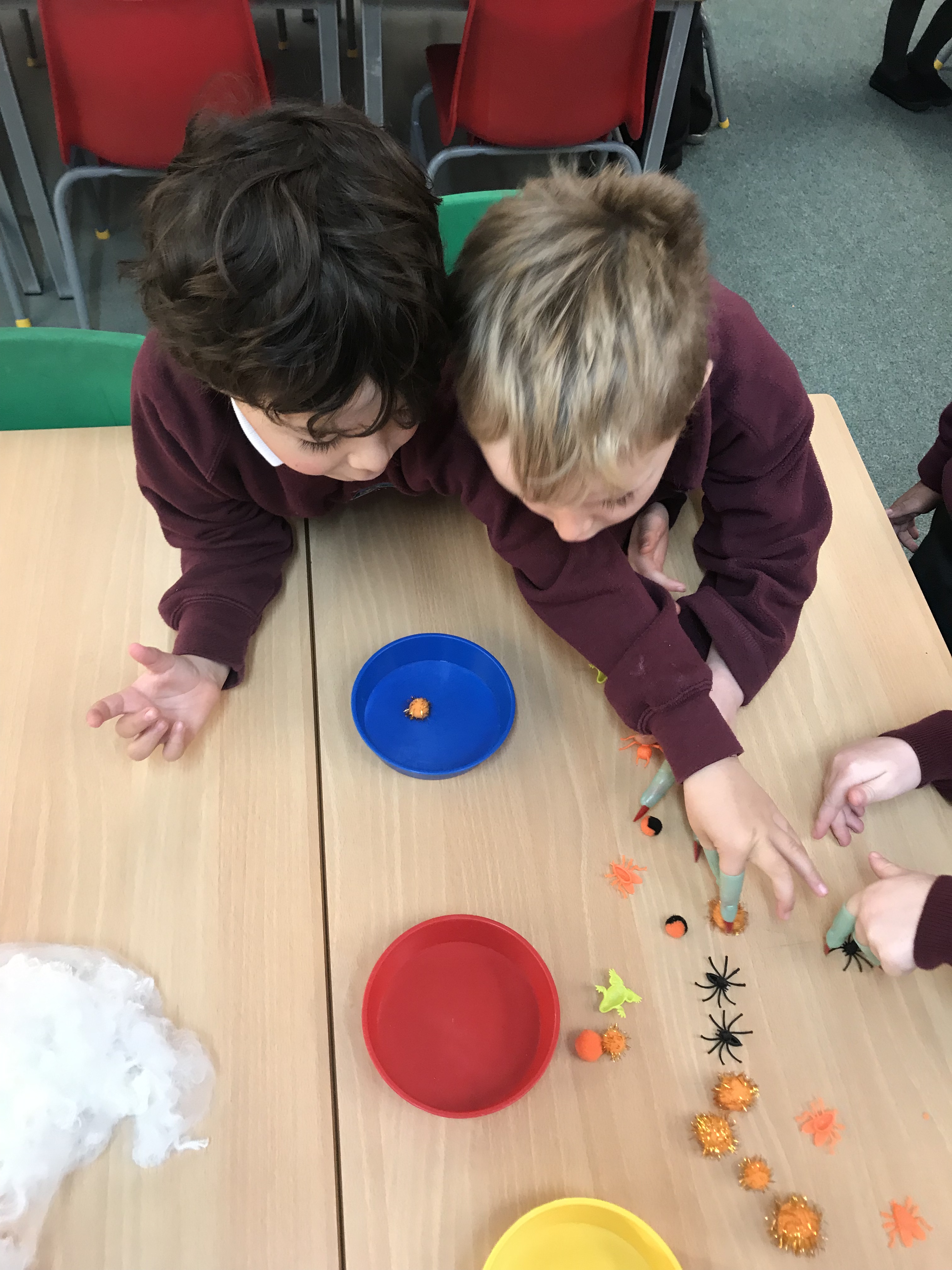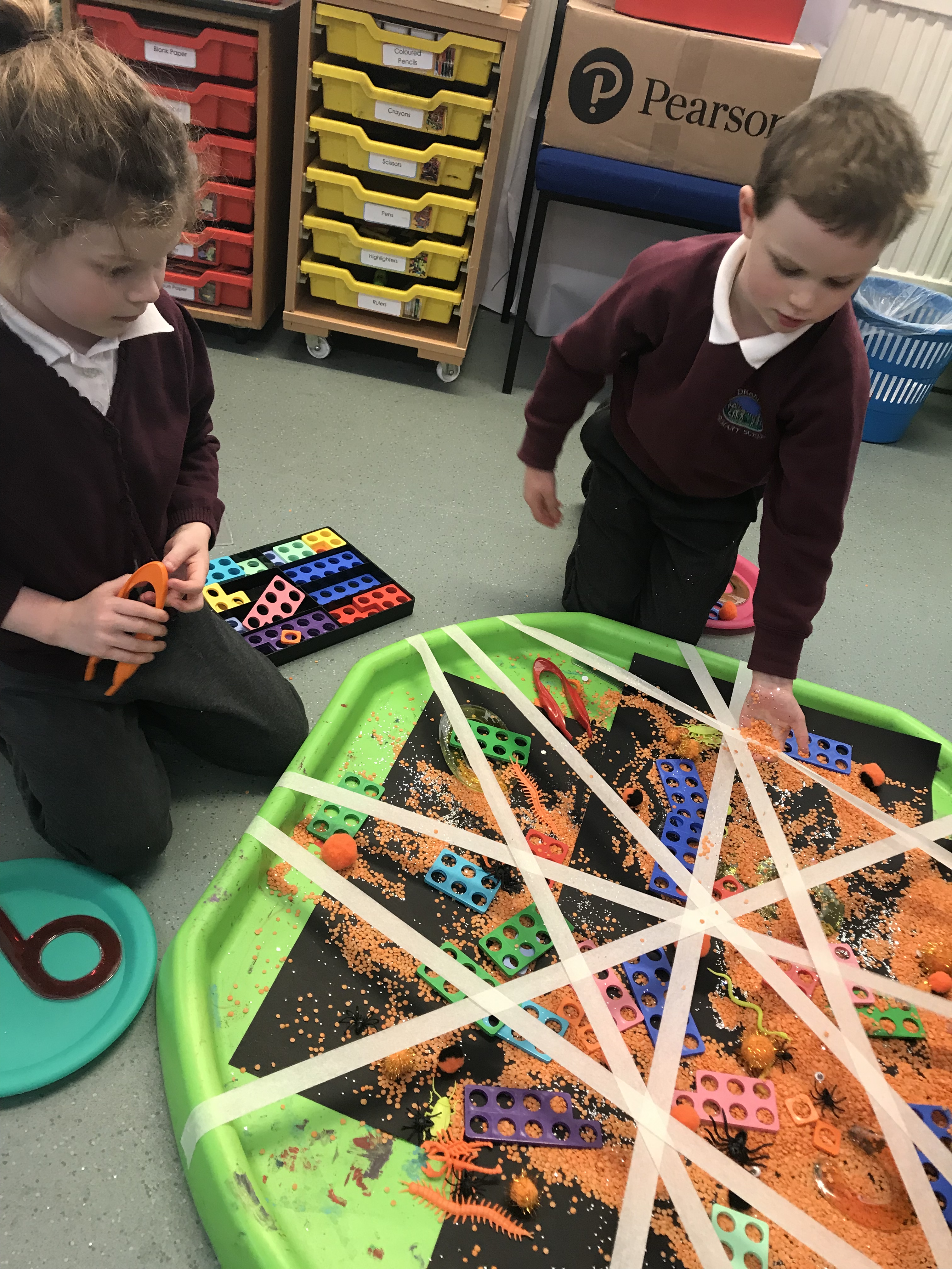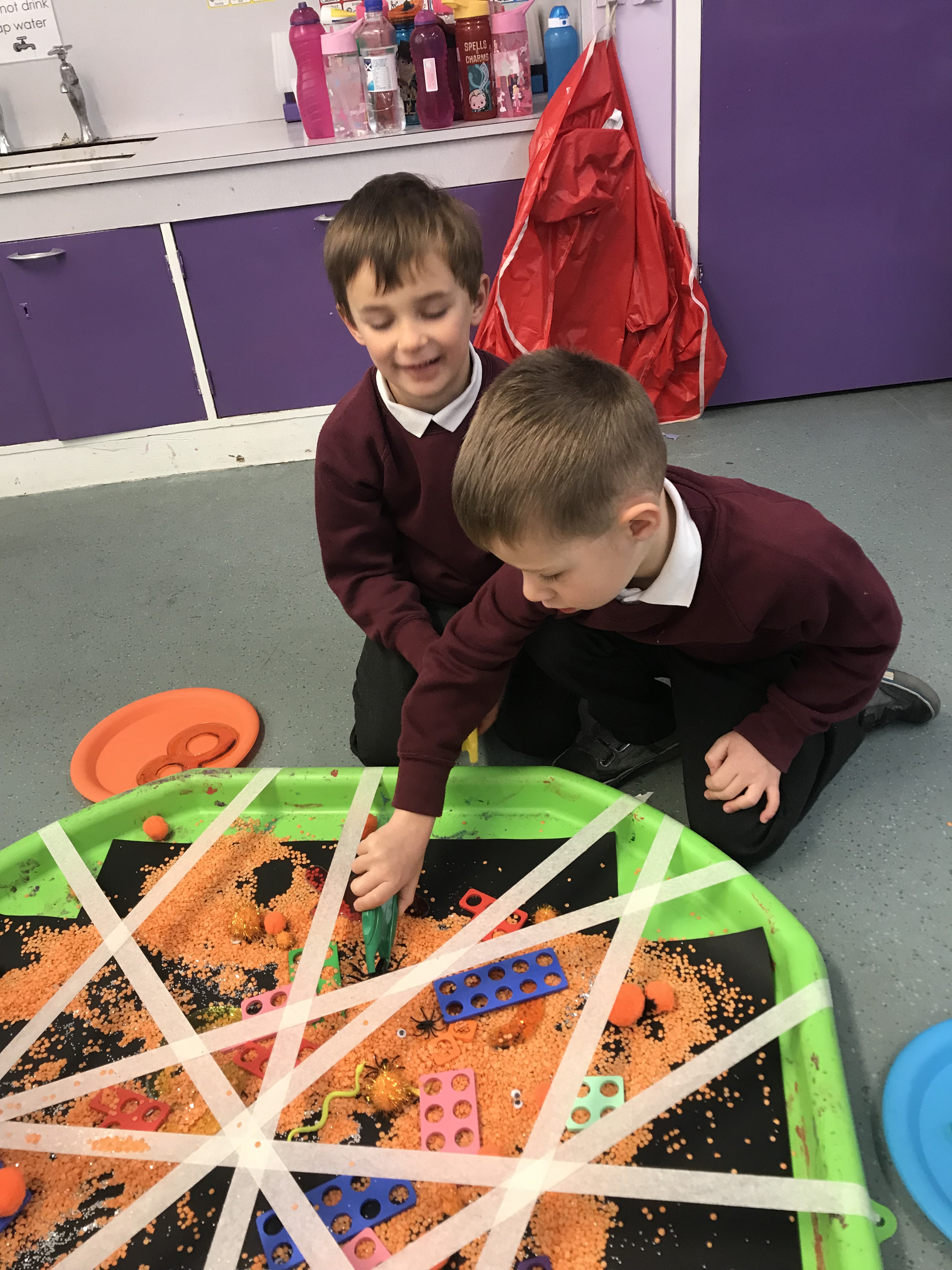 On Thursday morning during soft start we had a selection of activities with a spooky twist! Sticky and slimy sensory play, finger gym (with extra long fingers), a numicon web and skeleton chalk drawings!